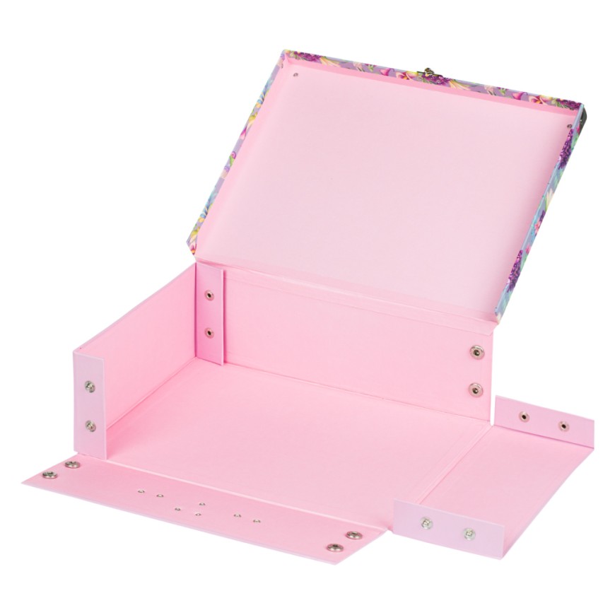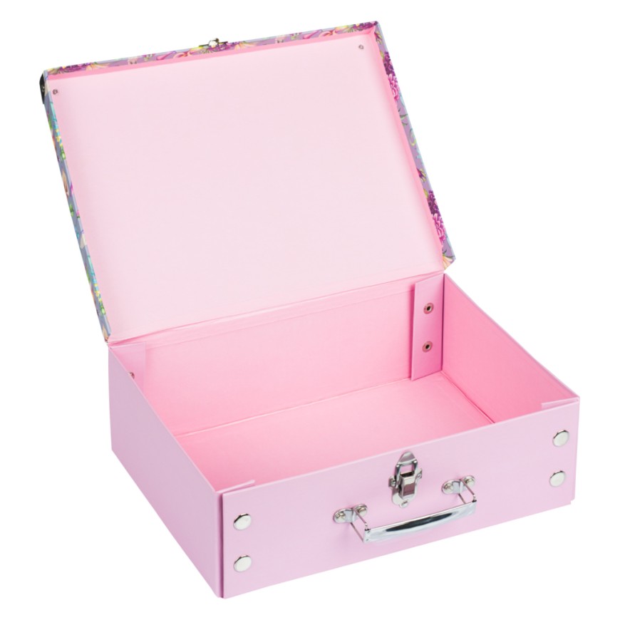• Skládací kufřík z pevného laminovaného papíru s okovanými rohy.