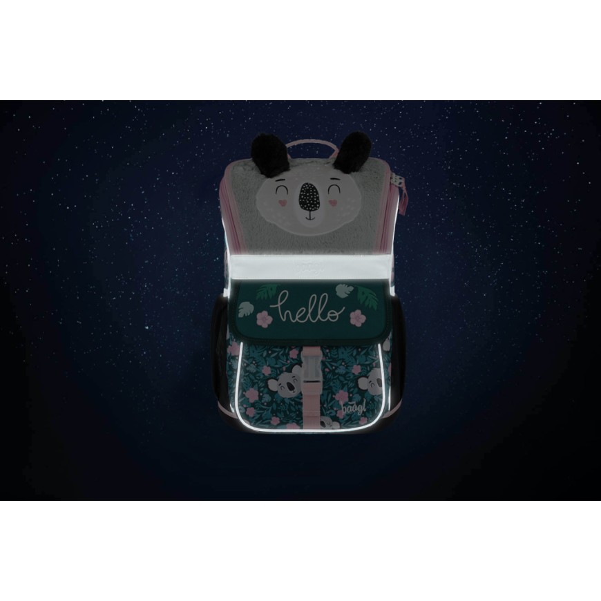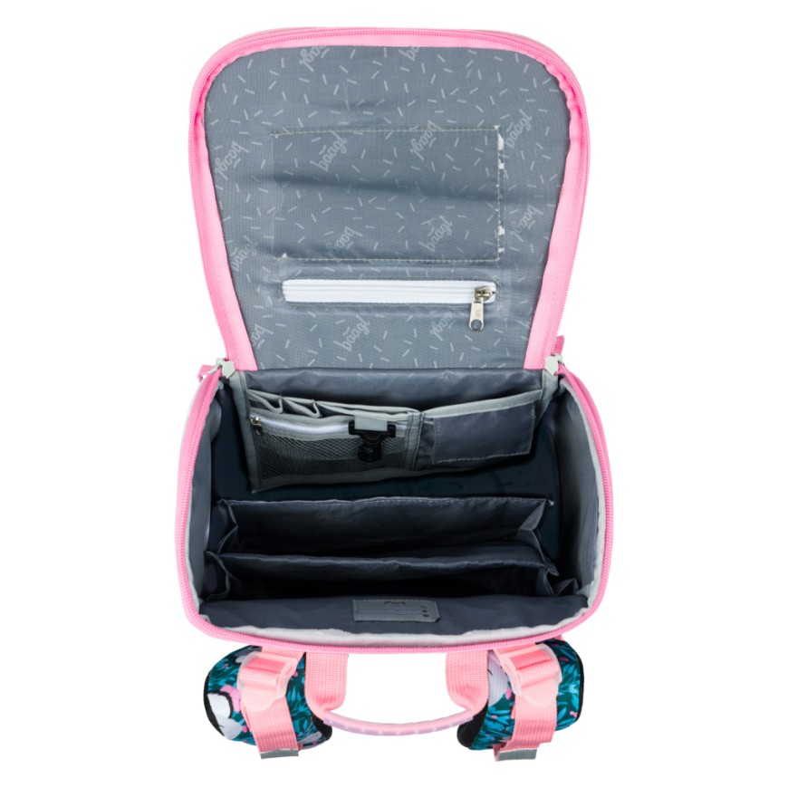 • Uvnitř aktovky je průhledná kapsa na rozvrh a vnitřní organizér umožňující rovnoměrné rozložení hmotnosti, doplněný gumičkou pro fixaci.