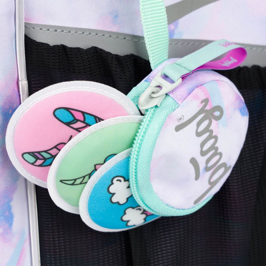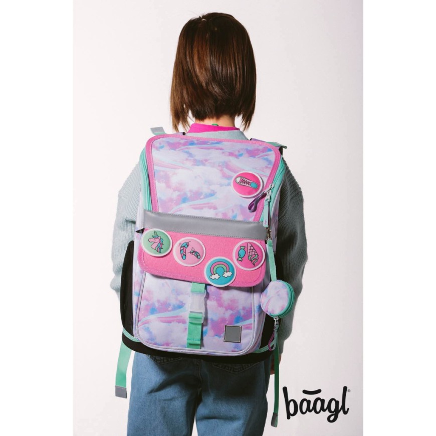 • Na klopu přední kapsy můžete libovolně připevňovat odznáčky, které jsou k aktovce jako dárek.