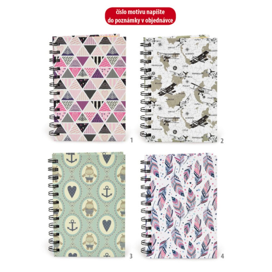 Linkovaný blok A6 - 12x16cm v pevných deskách a se spirálou obsahuje 80 stran. Baleny jsou po 10ks (mix 4 designů). Do poznámky v objednávce uveďte prosím Vámi vybraný design.