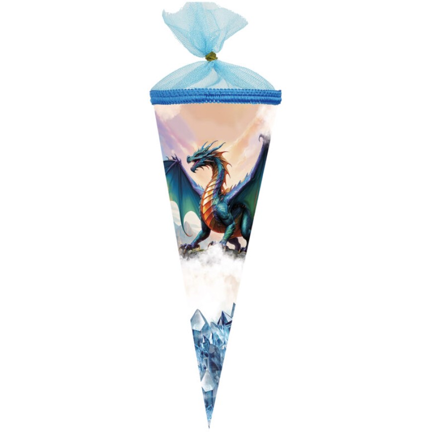 Papírový školní kornout kulatý o výšce 35 cm s tylovým lemem.