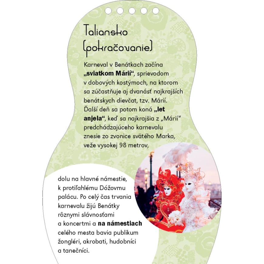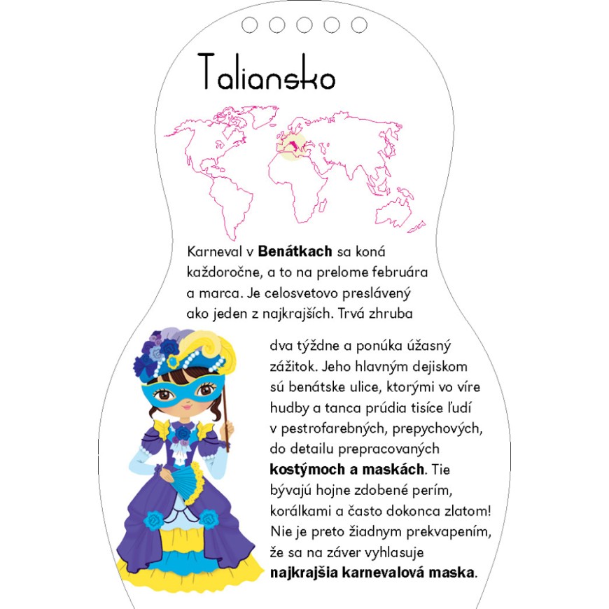 Další titul oblíbené série, která našla své obdivovatele v desítkách zemí světa, představuje malým čtenářům modely, které se oblékají na karnevaly konané v různých koutech světa. Kreativní omalovánky, spousta samolepek… knížka obsahuje vše, co je třeba k vytvoření nesčetných rób na karneval. A k tomu se děti dočtou i spoustu zajímavých informací navrch! Kdy a kde se konají nejznámější světové karnevaly, jak probíhá karnevalové veselí, průvody a další akce spojené s těmito událostmi? To a ještě mnohem víc se dozvíte, vydáte-li se za poznáním s našimi panenkami. A ke každé knížce dostanete krásný náramek pro štěstí!
