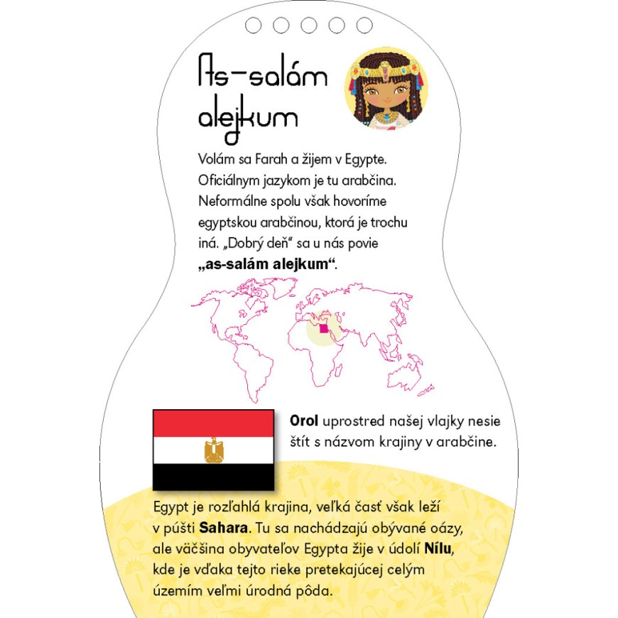 Další titul oblíbené série, která našla své obdivovatele v desítkách zemí světa, představuje malým čtenářům kouzlo Egypta prostřednictvím panenky Farah. Kreativní omalovánky, spousta samolepek… knížka obsahuje vše, co je třeba k vytvoření nesčetných modelů podle egyptské módy. A k tomu se děti dočtou i spoustu zajímavých informací navrch! Jak se jejich vrstevníci v Egyptě zdraví, jak se tam učí, na jakých specialitách si pochutnávají? Víte, co je to košarí nebo džalabíja? To a ještě mnohem víc se dozvíte, vydáte-li se za poznáním s našimi panenkami. A ke každé knížce dostanete krásný náramek pro štěstí!