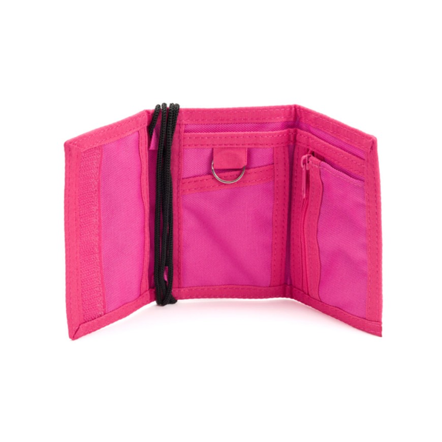 Peněženka se zavře suchým zipem a zavěsí na krk látkovou šňůrkou.