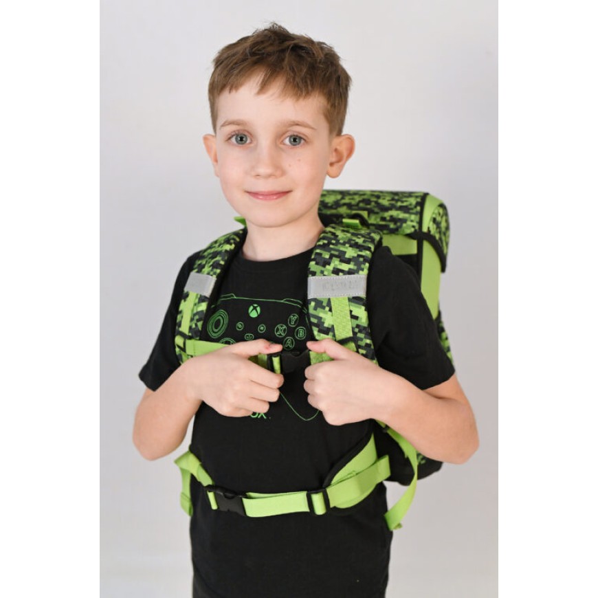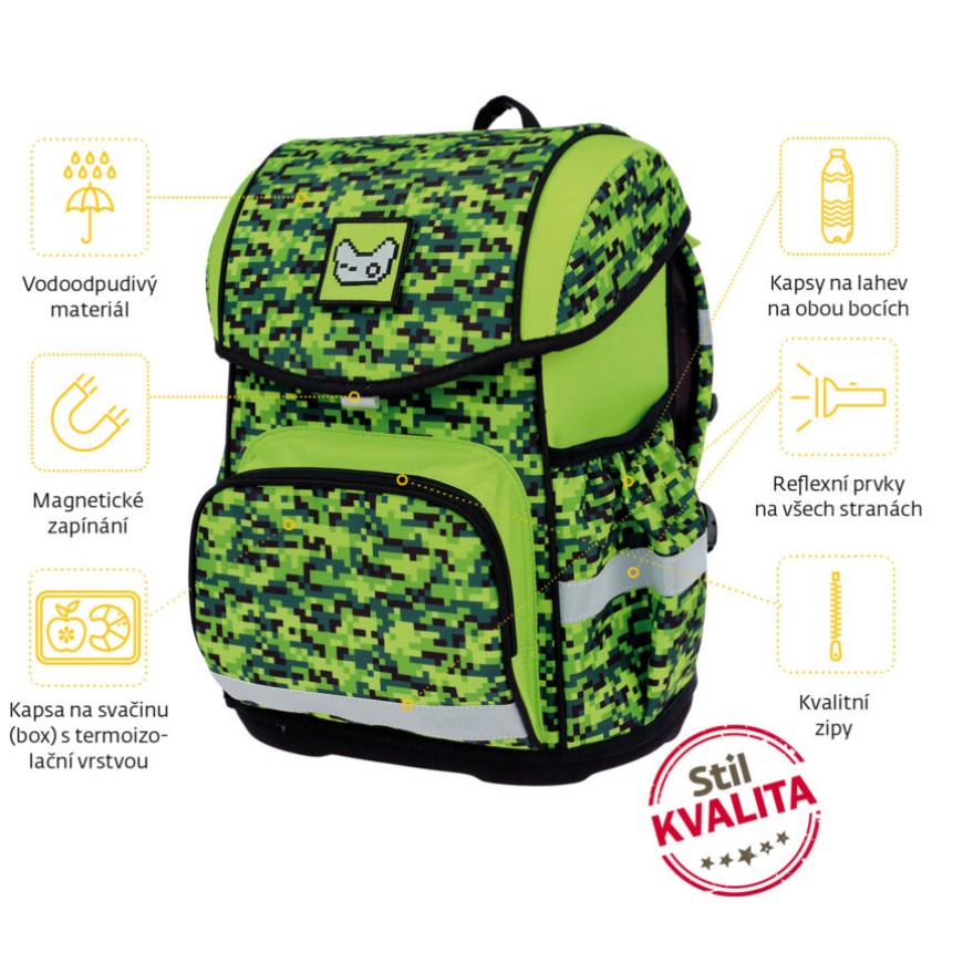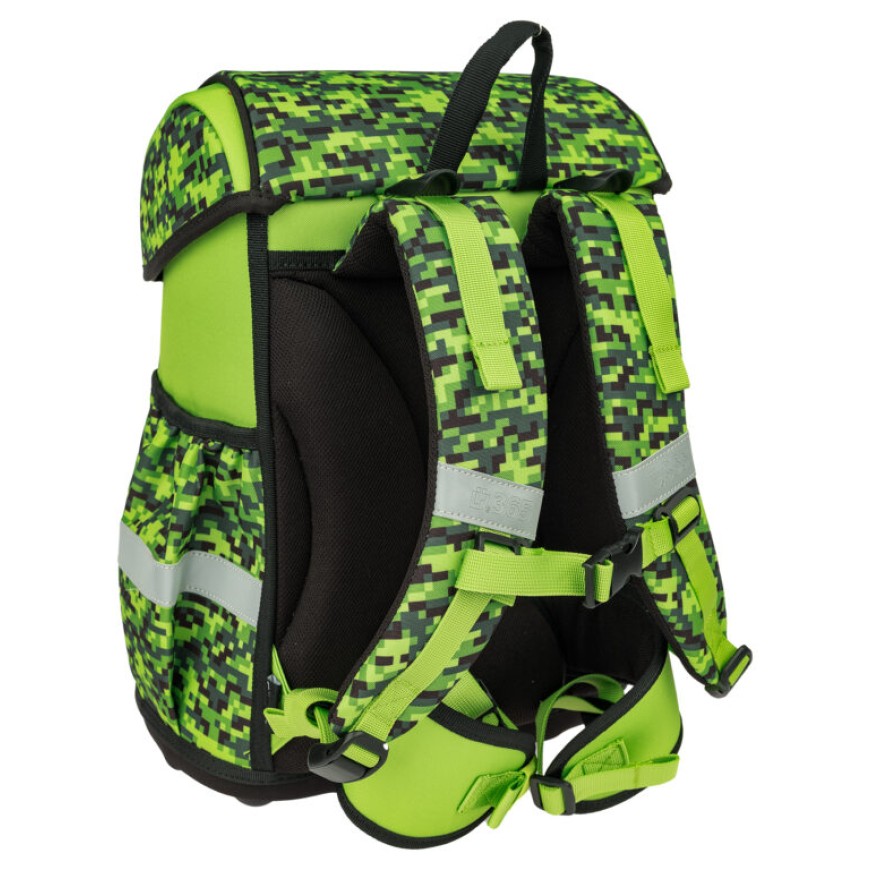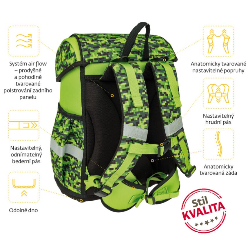 Kvalitní, ergonomická a velmi odolná školní aktovka je vybavena reflexními prvky a anatomicky tvarovanými zády s pevnou konstrukcí