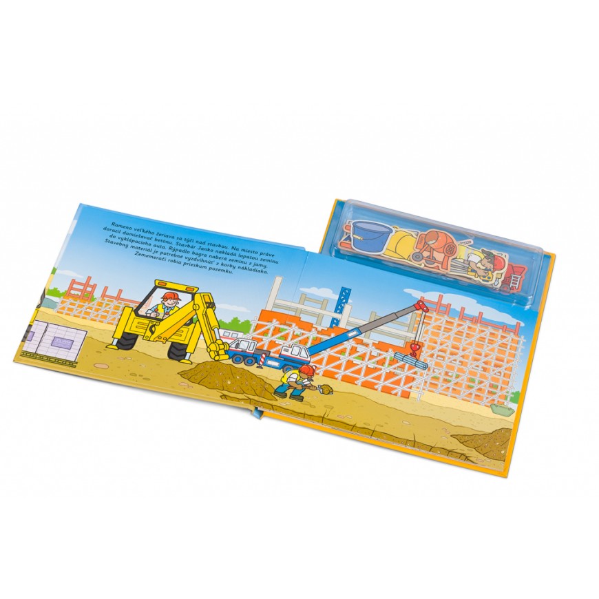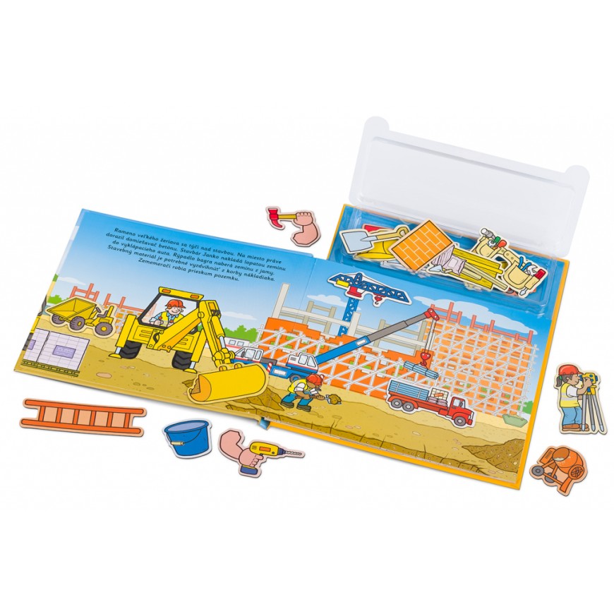 Na staveništi je pořád rušno – co se tam asi bude dít dnes? Jeřáb, míchačka, sklápěč, nejrůznější nářadí, ale třeba taky ochranná helma – to všechno je na stavbě potřeba. A těch dělníků a řemeslníků různých profesí! Na každé stránce téhle knížky objeví děti kratičký příběh, který mohou spoluvytvářet pomocí magnetek. A až si do sytosti vyhrají, mohou všechny magnetky zase pěkně uklidit zpátky do úložného boxu, kde budou připraveny na další skvělou zábavu.